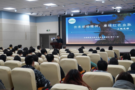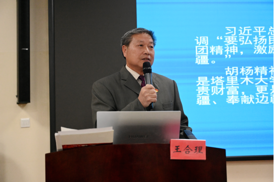 随后,王合理教授以“传承胡杨精神,赓续红色血脉”为主题开展专题讲座。作为深耕塔里木大学多年的老教师,王合理教授结合自身在学校的工作经历与塔里木大学的发展历程,生动阐释了胡杨“生而千年不死、死而千年不倒、倒而千年不朽”的精神内核。他指出,塔里木大学自创办以来,始终与胡杨精神紧密相连,一代代塔大人正是凭借着这种坚韧不拔的精神,在边疆教育事业中攻坚克难、砥砺前行。讲座中,王合理教授还分享了诸多校史中的红色故事,让在场师生深刻感受到胡杨精神与红色血脉在学校发展中的传承与延续,引发了师生们的强烈共鸣。